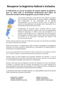 El documento fue firmado por los mandatarios y lleva por título “Recuperar la Argentina federal e inclusiva”. Allí, los gobernadores sostuvieron que el federalismo constituye uno de los pilares del sistema de gobierno argentino, y remarcaron que resulta una herramienta clave para alcanzar un desarrollo equilibrado desde lo territorial y justo desde lo social.