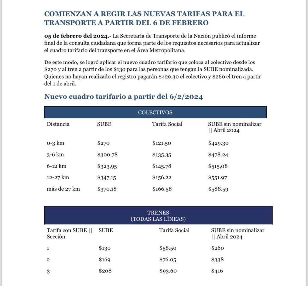 En tanto, se ratificó que el sistema de diferenciación de tarifa para las SUBE nominalizadas comenzará a regir a partir del 1 de abril de 2024, y hasta esa fecha, todas las tarjetas pagarán la tarifa de tarjetas nominalizadas.