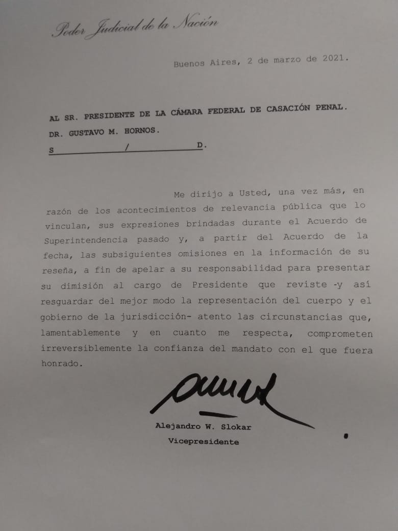 “Me dirijo a usted, una vez más, en razón a los acontecimientos de relevancia pública que lo vinculan, sus expresiones brindadas durante el Acuerdo de Superintendencia pasado, y a partir del Acuerdo de la fecha, las subsiguientes omisiones en la información de su reseña, a fin de apelar a su responsabilidad para presentar su dimisión al cargo de Presidente que reviste”, apuntó la carta dirigida por Slokar apenas terminó la tumultuosa reunión. “Y así (con la renuncia) resguardar del mejor modo la representación del cuerpo y el gobierno de la jurisdicción- atento a las circunstancias que, lamentablemente y en cuanto me respecta, comprometen irreversiblemente la confianza del mandato con el que fuera honrado”, culmina la misiva que hizo estallar una interna que venía tomando temperatura con comunicaciones previas.